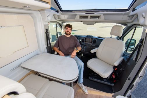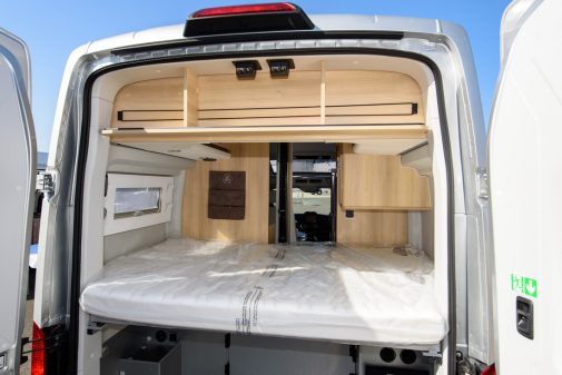 Le Miramar est encore un petit jeune dans la famille Campérêve. Apparu lors de la présentation de la précédente collection, ce fourgon sur Ford Transit est livré, en standard, avec une motorisation forte de 170 ch et associé à une boîte de vitesses automatique. Sous des dehors assez classiques, ce fourgon aménagé dispose d’une soute et d’un lit modulables. Ce dernier profite de deux sommiers à lattes “peigne” qui coulissent l’un dans l’autre. En superposant les matelas ou en en remisant un, ce dispositif permet de libérer un espace de chargement (juste après les portes arrière) qui est dégagé sur la largeur. De quoi y ranger un vélo.