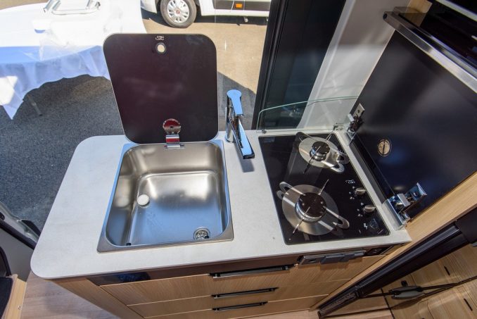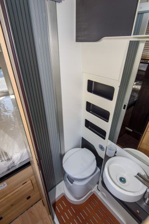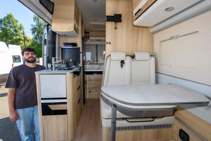 La partie avant est plus classique avec banquette face route, cuisine à l’entrée et salle d’eau modulable grâce à une paroi - douche d'un côté et vasque de l'autre- pivotante. Il y a également un grand réfrigérateur à compression de 140 l intégré dans un meuble colonne.