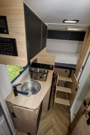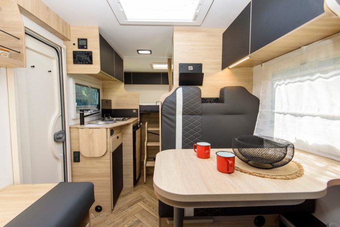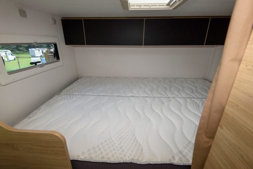 La partie avant est dédiée à la dînette, prévue pour recevoir quatre convives. La zone arrière loge un lit transversal sur soute, accessible par un astucieux escalier escamotable (marches se replient et se rabattent). Et pour se distinguer, le constructeur a opté pour un couchage dit “papillon”. Il offre une plus grande modularité d’utilisation en se rabattant par moitié, libérant de la hauteur en soute ou donnant accès aux rangements.
