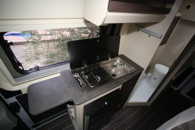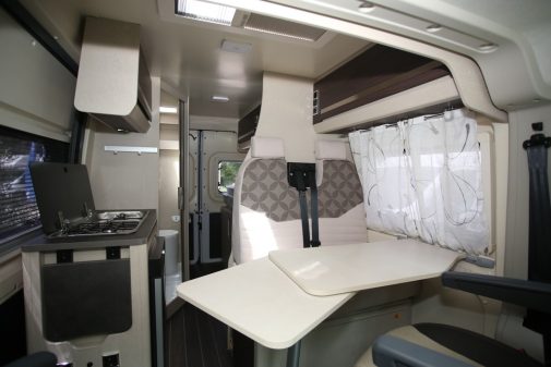 A l’avant, pas de révolution notable. On retrouve une implantation classique avec un bloc-cuisine composé d’un réchaud deux feux,d' un évier Inox et d'un plan de travail. Le salon permet à quatre personnes de prendre place autour de la table grâce à la banquette face route et aux deux sièges avant pivotants.