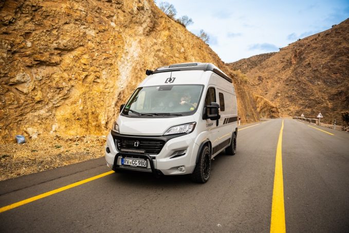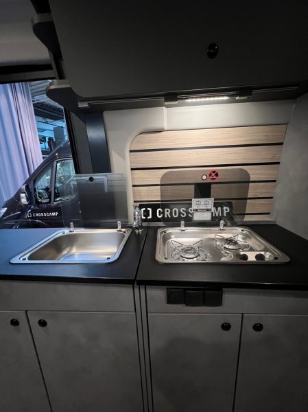 A l’arrière, un meuble colonne accueille le réfrigérateur ainsi que des rangements côté droit, tandis que l’espace à gauche est prévu pour une douche-chaussette (la bonde du receveur se plaçant dans une évacuation au plancher, le rideau s’accrochant au pavillon) et une penderie textile. Une modularité pensée pour les sportifs qui ne trouvaient jusqu’alors leur bonheur que chez certains artisans. Ce CrossCamp Flex 541 peut être équipé d’un toit relevable (+ 6 049 €), exacerbant encore sa polyvalence.