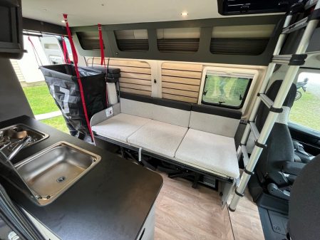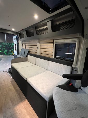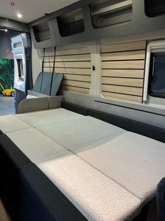 En arrivant sur le créneau du fourgon, CrossCamp crée la surprise. Et cette dernière prend une autre ampleur lorsqu’on découvre le Flex 541 qui, comme son nom l’indique, est un compact (5,41 m) sur Ford Boxer ou Opel Movano, à la flexibilité poussée. Pas moins de quatorze configurations possibles sont annoncées !