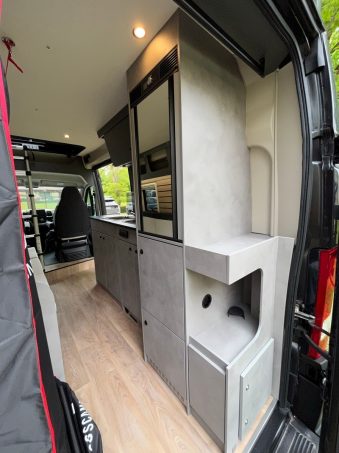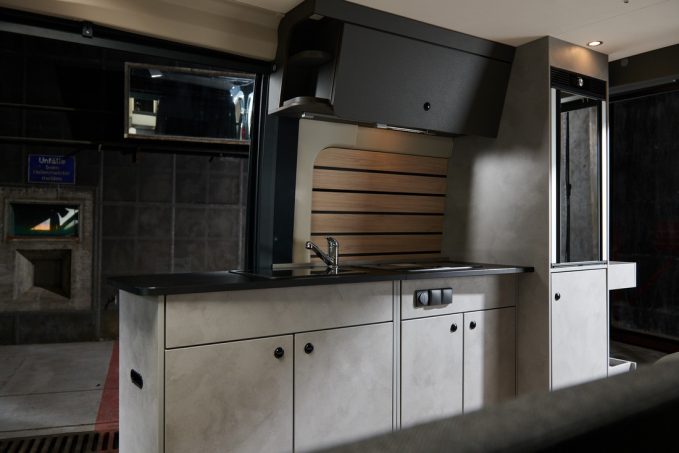 La cuisine est positionnée logiquement à l’entrée et paraîtrait presque classique, mais sa partie évier, avec jerricans d’eau (10 l), peut être ôtée.