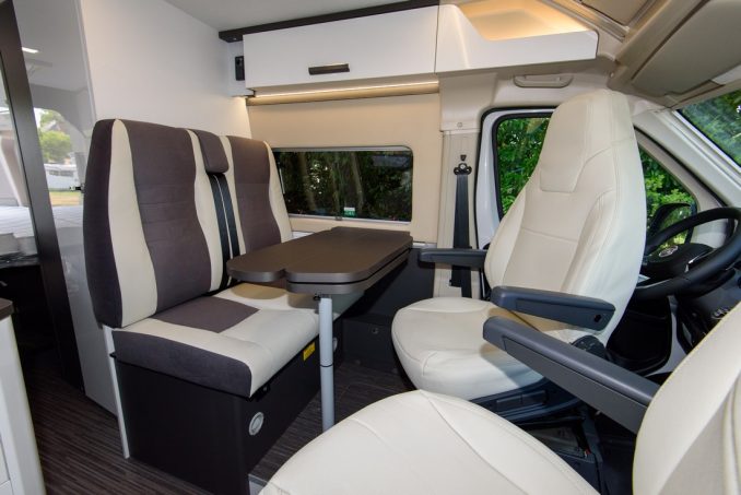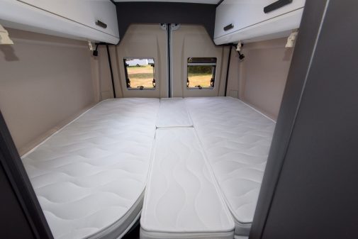 Les lits jumeaux donnent aussi satisfaction aux usagers. Longs et larges, ils sont formés d’un bon matelas de mousse posé sur un sommier à lattes. Un coussin installé entre les deux permet de former un immense couchage. Sous le toit relevable, disponible en option, vient s’installer un second couchage.