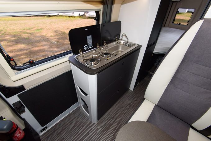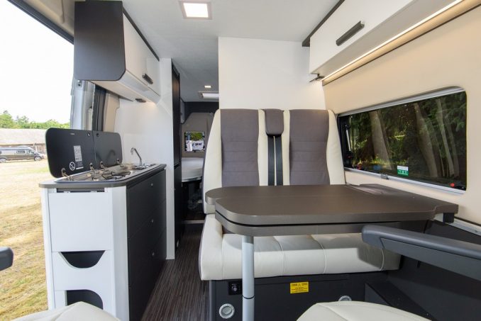 Parmi les véhicules McLouis les plus appréciés, figure le Menfys 4S-Line identifiable à ses lits jumeaux. Avec ses 6,36 m, il est le plus le plus long des fourgons de l’aménageur italien. Ce gabarit lui permet d’offrir un niveau élevé de standing. Les utilisateurs profitent d’un vaste salon où quatre personnes peuvent s’attabler. Le bloc-cuisine latéral intègre un réfrigérateur à compression – toujours efficace, y compris quand le mercure frise les températures hautes, à l’extérieur.