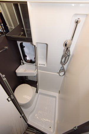 Les transformations importantes réalisées dans le Menfys 4 S Line concernent surtout la salle d’eau où le rideau de séparation en Nylon a cédé sa place à une paroi de douche rigide pour constituer une vraie cabine. De plus, on dispose désormais d’une douchette indépendante du lavabo (lequel est escamotable pour libérer de l’espace). Ces changements peuvent sembler anodins, mais à l’usage, ils apportent un réel confort.