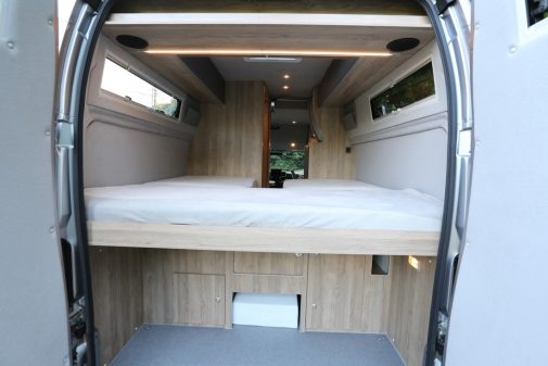 En complément, on retrouve des lits jumeaux en partie arrière. Pour stocker des éléments volumineux, chaque tête de lit peut être relevée avec un système de vérins.