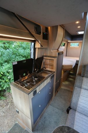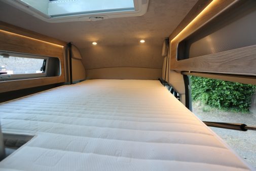 Place donc à l’Avanti EBF, combinaison de l’agencement des Avanti EB et F. Ce fourgon de 6,36 m de long dispose d’une rehausse de toit avec une hauteur culminant à 2,88 m – ce qui permet de loger, un lit de pavillon. Ce couchage se positionne dans le sens de la longueur. Sur le modèle présenté, il dispose d’un matelas de 200 cm côté droit et 185 cm côté gauche, la paroi du cabinet de toilette venant légèrement tronquer la longueur du lit.