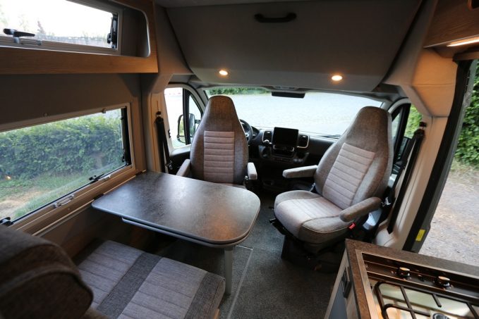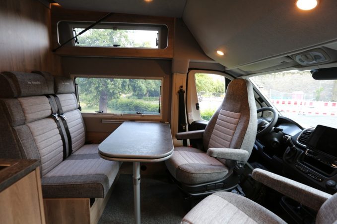 Malgré la présence du couchage, la hauteur sous pavillon reste correcte, surtout au niveau de la dînette. Celle-ci se compose d’une banquette deux places face route et des sièges pivotants de la cabine. Elle se destine à un usage à quatre.