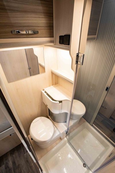 Derrière le siège conducteur, on retrouve le poste sanitaire isolé par un rideau coulissant. Le compartiment est relativement spacieux, et on apprécie la porte transparente qui permet d’isoler la douche des WC.