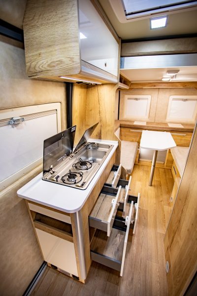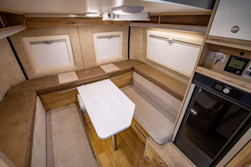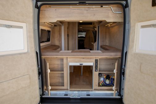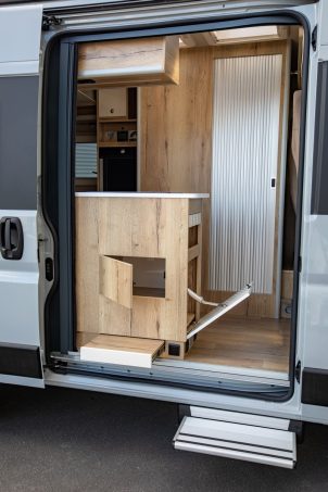 Pour conserver l’esprit fourgon, Mega Mobil a disposé une trappe dans le mobilier pour faciliter l’accès depuis les portes arrière dans le cas d’une utilisation “soute”.