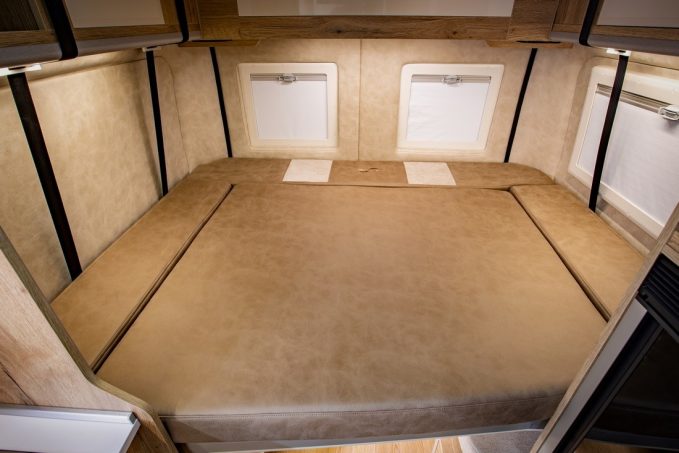 On retrouve dans le 540 Lounge, une dînette composée de banquettes en vis-à-vis pour quatre personnes. La table vient en complément. Cet espace se transforme en chambre à l’étape, grâce au lit de pavillon. Ce dernier descend jusqu’aux assises du salon et profite des éléments des dossiers pour augmenter la surface de couchage (matelas de 144 x 190 cm).