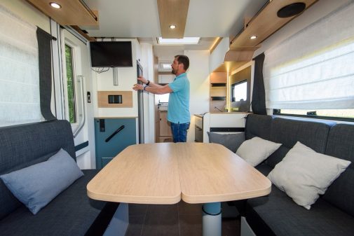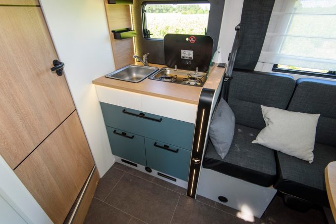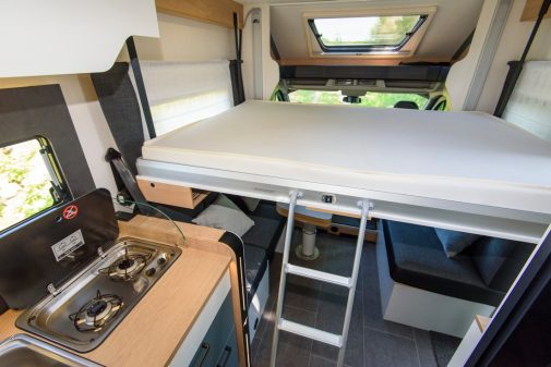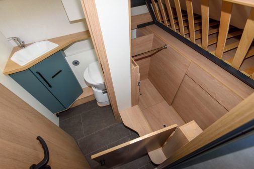 La salle d’eau se divise en deux espaces. D’un côté, la douche et, de l’autre, le lavabo avec WC. Le couchage arrière est un lit transversal sur soute, sous lequel on retrouve une penderie et un espace rangement.