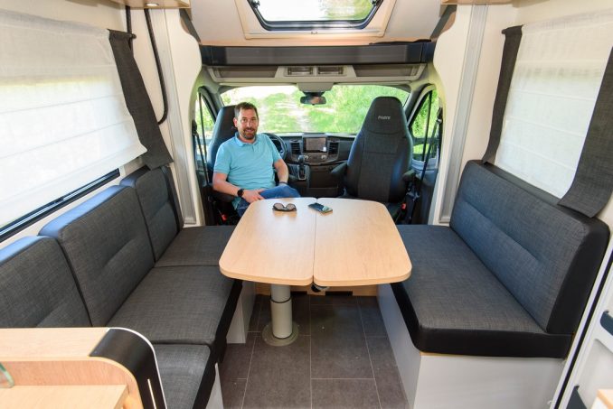 A bord, on retrouve une ambiance inédite : les tons foncés de la sellerie et du sol s’harmonisent avec les touches de bois et de la couleur bleue de l’ameublement. Le salon se compose de deux banquettes face-face, des sièges de cabine pivotants et d’une table dont le plateau se plie par le milieu. Les baies de chaque côté, complétées par un lanterneau au-dessus du poste de pilotage, offrent un bel espace lumineux. Le bloc-cuisine est classique avec un évier, un réchaud deux feux et un grand réfrigérateur.