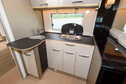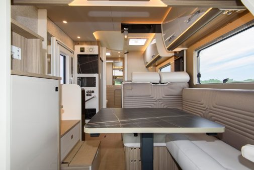 Pour le reste, le TD689 G offre un habitacle raffiné et surtout très aéré. Outre la chambre en pavillon – accessible par de vraies marches faisant office de rangement –, la partie avant est occupée par un salon. Il se compose d’une banquette en L et des sièges pivotants de la cabine. L’ensemble prévu pour cinq personnes prend place autour de la table montée sur un pied central télescopique.
