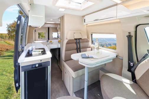 La configuration de la chambre dans un gabarit aussi contenu impose de faire quelques sacrifices sur les autres postes. La dînette est un peu étriquée pour quatre personnes et l’espace disponible dans la salle d’eau s’en trouve également réduit. Heureusement que la vasque rabattable permet de gagner des centimètres cubes. Le meuble de cuisine latéral est pourvu d’un réfrigérateur à compression installé en bout et muni d’une double ouverture.