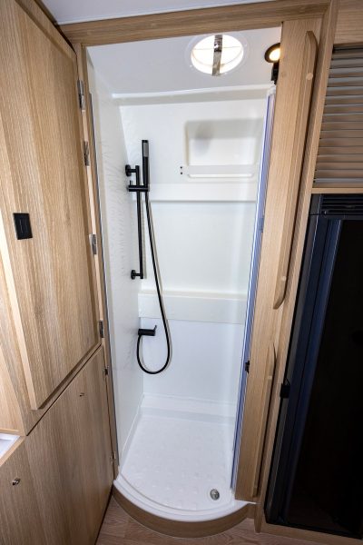 Le Magellan 643 nous est bien connu. Ce best-seller de l’offre Campérêve présente un plan singulier puisqu’il fait partie des rares fourgons disponibles avec douche séparée. Un vrai plus dans un modèle de moins de 6 m. La salle d’eau se compose donc de deux espaces (cabinet de toilette et douche) qui peuvent être joints grâce à une porte à double chambranle. Cette dernière sépare l’ensemble de la dînette.