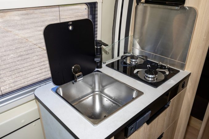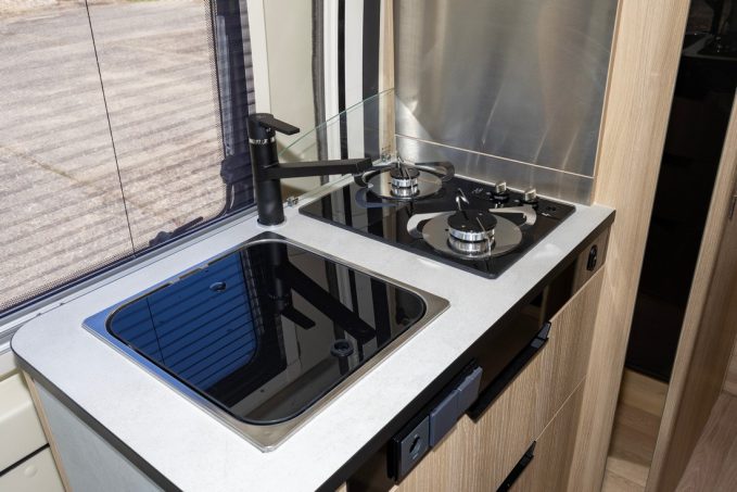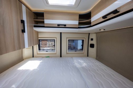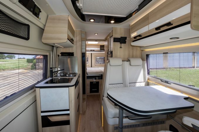 Côté chambre, c’est la penderie pivotante Modul’Space (remisée dans la douche ou au-dessus du lit) qui ferme l’endroit. Pour le reste, ce 643 la joue classique avec un salon composé d’une banquette deux places face route et des sièges de cabine pivotants, une cuisine à l’entrée et un lit transversal (132 x 195 cm) à l’arrière.