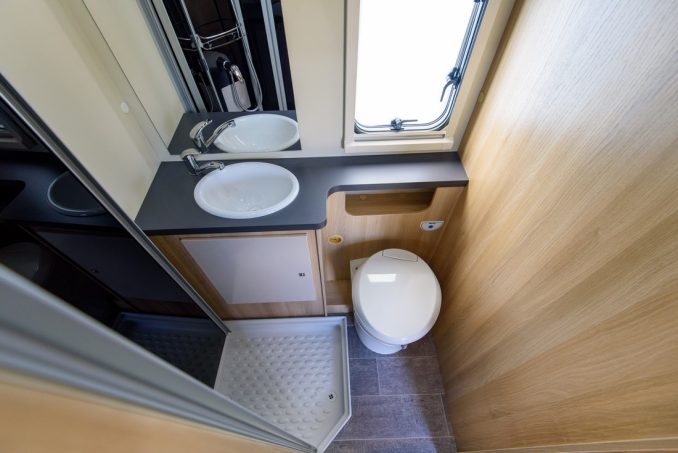 Côté salon et bloc-cuisine, pas de surprises, on y observe une table qui se plie façon portefeuille, des banquettes face-face et les sièges pivotants de cabine. La cuisine est équipée d’un réchaud deux feux, d’un évier Inox et d’un grand réfrigérateur de 136 l.