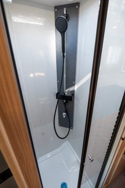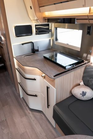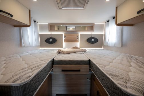Développons avec la finition Millenium dont profite le 74 LJG, comme les deux autres intégraux de la gamme Wincester. Ce modèle est une longue unité de près de 7,50 m qui se distingue par sa chambre dotée de lits jumeaux (80 x 200 cm), perchés sur une vaste soute de 3 000 l. La finition Millenium permet de bénéficier d’une ambiance particulière orientée sur l’univers du rugby, mais également de quelques équipements additionnels. Les clients profitent alors de 3 600 € d’avantages.
