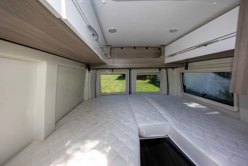 Au-delà du châssis, ce R620 se distingue par une implantation connue et surtout parfaitement maîtrisée par l’aménageur. Pour être totalement transparent, ce Randger reprend à l’identique le plan du Master Van Duo de Font Vendôme. Ainsi, la chambre arrière reçoit des lits jumeaux de 80 x 200 cm… enfin 184 cm exactement pour le couchage de droite. L’accès à ces lits indépendants est assuré par un couloir central sur toute la longueur. L’ensemble peut néanmoins être réuni si besoin, grâce au sommier rétractable et à la rallonge de matelas.