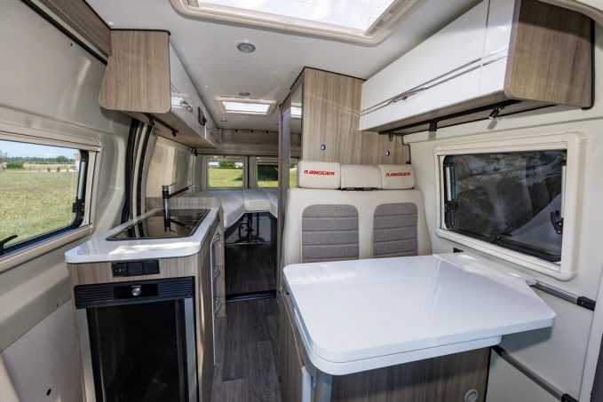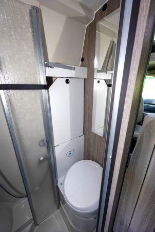 La partie avant accueille le salon qui se compose d’une banquette face route pour deux personnes, à laquelle viennent s’ajouter les assises pivotantes du poste de conduite. L’espace sanitaire se trouve entre la chambre et le salon, dans un espace réduit certes, mais modulable a minima.