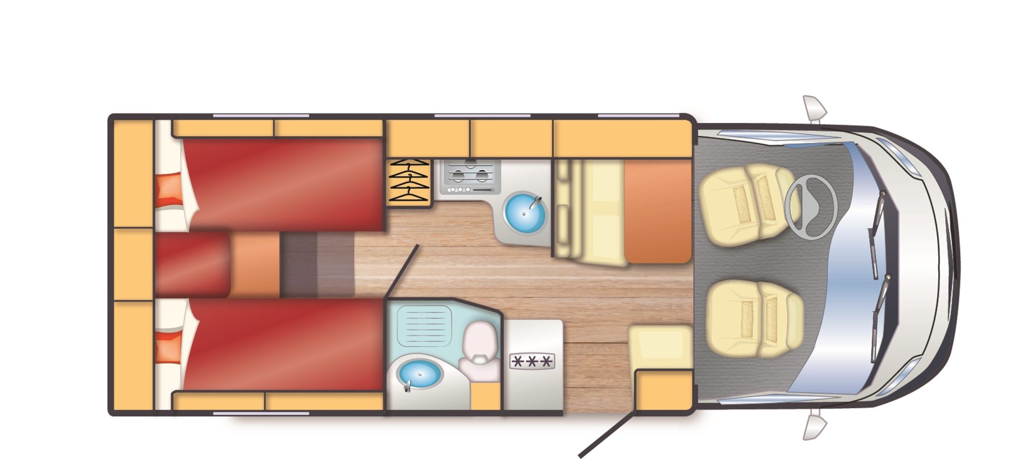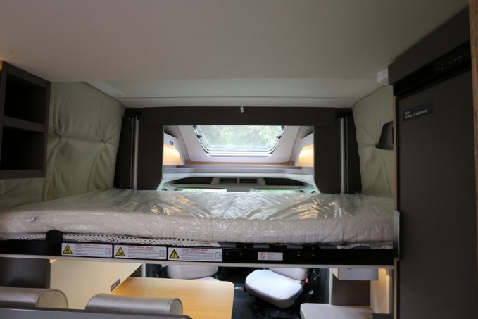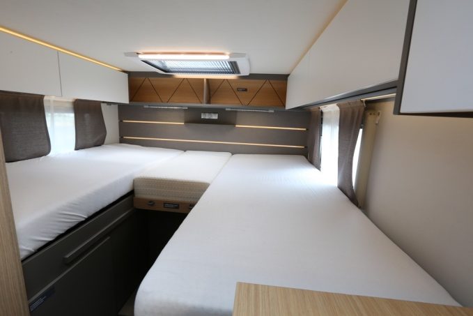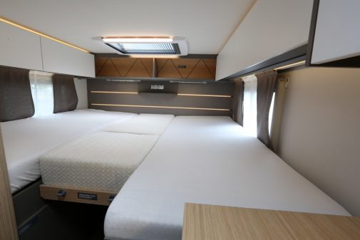 Ces lits indépendants sont haut perchés, laissant un volume suffisant en partie basse, pour disposer des penderies au pied des lits ainsi qu’une grande soute. Cette dernière est accessible de l’extérieur par deux portillons latéraux. Elle est équipée de rails sur lesquels coulissent des crochets d’arrimage. De dimensions généreuses, on peut y stocker de nombreux équipements, à condition de ne pas dépasser la charge maximale autorisée de 250 kg.