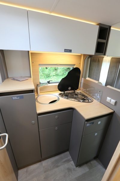 Dans la salle d’eau, tout est réuni dans un compartiment unique. Pour prendre une douche, il faut au préalable déployer des battants qui isolent la cabine et évitent les projections. Dans cette cabine, on déplore la marche pour le passage de roue dont l’emprise au plancher est très importante.