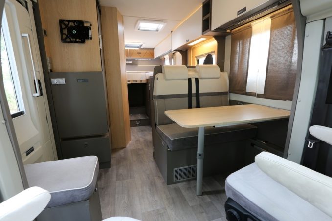Le salon accueille cinq convives qui prendront place sur les sièges pivotants du porteur, la banquette face route et le sofa latéral. Ce petit canapé est monté sur rail. Il peut lui aussi coulisser pour s’approcher de la table, laquelle est munie d’une rallonge escamotable.