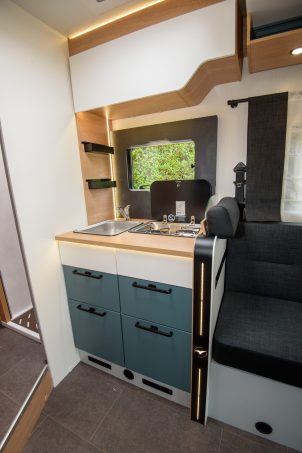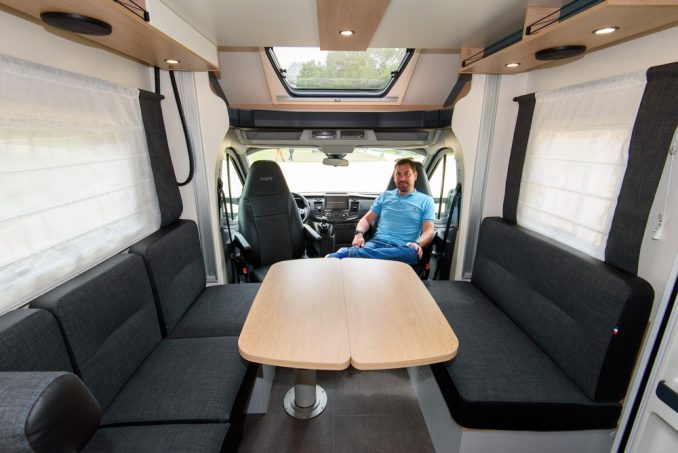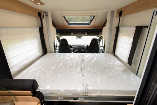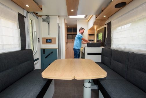 L’A656 D se distingue notamment par son ambiance intérieure et son mobilier inédit Sherwood Green. On apprécie le salon qui se compose de deux banquettes latérales face-face, dont les dimensions sont impressionnantes (en particulier le sofa derrière le siège conducteur). Cette longue banquette se transforme en deux sièges face et dos à la route. Ces assises ceinturent une grande table dont le plateau est fixé sur un pied déporté. Cette disposition améliore la circulation, mais gêne malheureusement l’accès à l’assise de gauche. Le salon est surmonté d’un lit de pavillon électrique de 140 x 200 cm qui s’abaisse jusqu’aux banquettes et remonte facilement. On peut également l’arrêter à mi-hauteur pour préserver l’espace en-dessous et utiliser le lit simple de dînette (98 x 200 cm).
