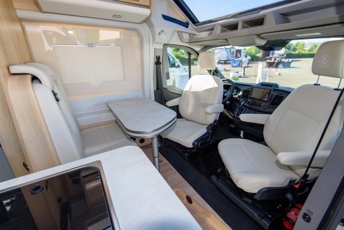 Outre l’esthétique inhabituelle générée par ces proportions, la sensation d’espace à bord est des plus agréables : combinaison de la cabine ouverte et du skyroof (une exclusivité Campérêve et Dreamer sur le porteur germano-américain). Accessoirement, ce toit dôme, disponible en option, joue un rôle essentiel sur la plastique du véhicule, l’allégeant quelque peu en réduisant le côté hydrocéphale propre aux cabines de grande hauteur.