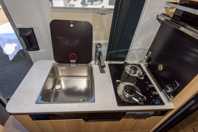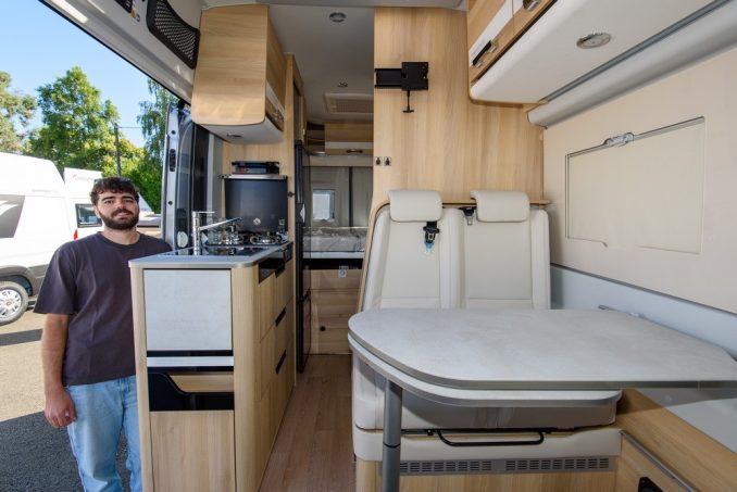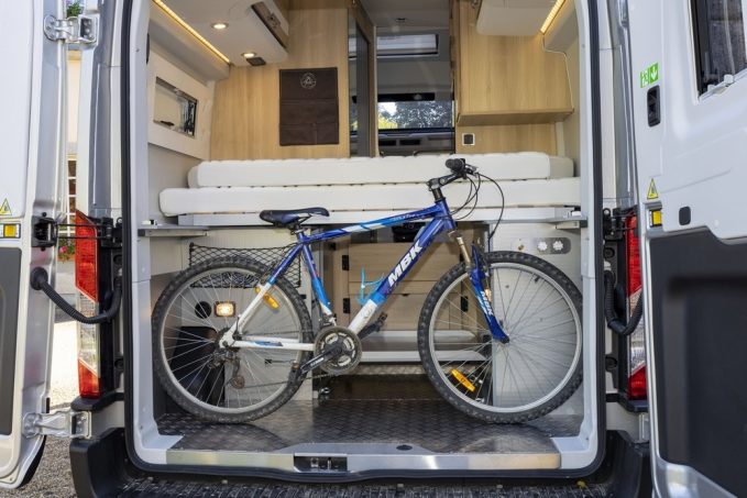 L’ambiance mêlant mobilier Natural (bois blond et bandeaux blanc laqué) et sellerie claire Arizona (en TEP, tissu enduit polyamide) crée un cocon lumineux et chaleureux, toujours avec cette grande hauteur sous pavillon. Les grands apprécieront. En jetant un œil au plan de masse, on serait tenté de se dire qu’il n’y a rien de nouveau. Ce serait oublier que le véhicule a en lui quelques gènes de feu Magellan 641, dévoilé en 2021 et qui n’a vécu que le temps d’une collection. De ce dernier, il a récupéré la modularité singulière de l’ensemble soute/chambre. Les sommiers à lattes, de type peigne, coulissent l’un d’un l’autre. En empilant les deux matelas, ou en en remisant un, il est alors possible de dégager le volume arrière. Un à deux vélos peuvent ainsi entrer transversalement. Le plancher recouvert d’une tôle grain de riz ne craint rien. Cette soute est complétée par un tiroir positionné entre les coffres abritant les réservoirs d’eau et l’installation électriques.
