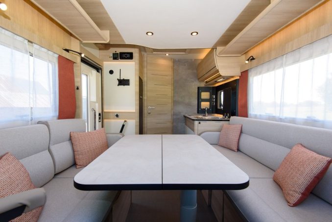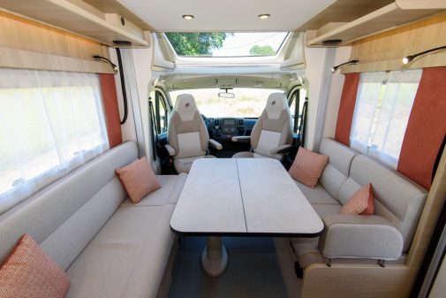 En ce qui concerne la zone de vie, elle occupe une grande zone sur l'avant du véhicule. La dînette se compose d’un grand salon avec des banquettes en vis-à-vis pouvant accueillir jusqu’à sept convives. Sur route en revanche, seule deux personnes sont autorisées à circuler face à la route grâce aux ceintures de sécurité habilement dissimulées sous les assises.