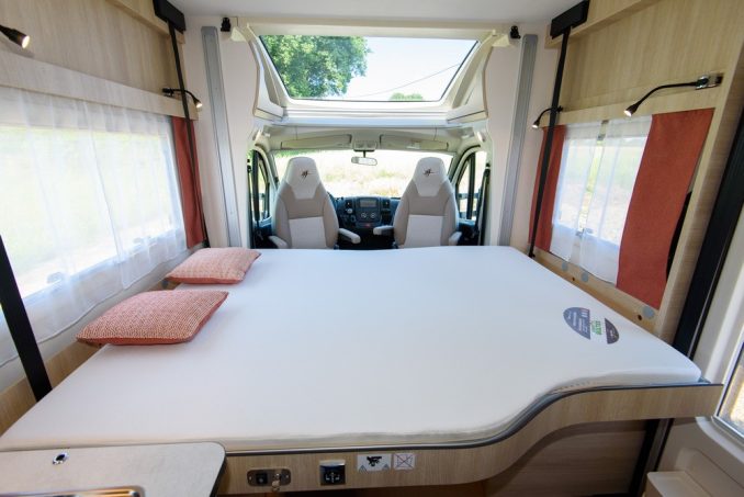 Mais revenons à l'étape. Pour la nuit, le coin repas peut se convertir en couchage double. Si le confort n'est pas optimal, on s'aperçoit rapidement que le lit principal se trouve évidemment en pavillon. La dînette est en effet surmontée d’un lit de pavillon électrique bénéficiant de dimensions généreuses de 150 x 195 cm. Le système électrique permet de le descendre jusqu’aux assises, à condition au préalable d’avoir abaissé électriquement la table montée sur pied télescopique, ou à mi-hauteur dans le cas d'un usage en version "lits superposés".