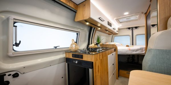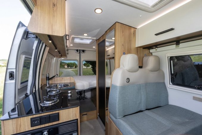Le frigo situé en façade du mobilier dispose d’une double ouverture. Côté tarif, Font Vendôme commercialise ce fourgon à partir de 62 490 € en version de base Confort.