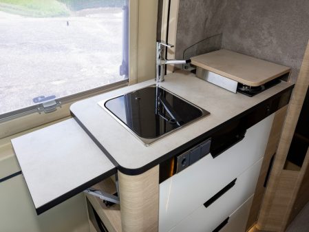 Le fourgon reçoit le système Modul’Space : la penderie logée sur le flanc du véhicule pivote dans la chambre et libère la cabine de douche, laquelle est indépendante du cabinet de toilette. Rare sur le secteur du fourgon, rappelons-le.