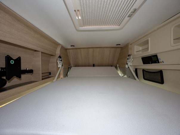 Ce fourgon de 2,88 m de haut dissimule, en partie avant au-dessus de la dînette, un lit de pavillon pour deux personnes de 130 x 190 cm. Ce couchage vient en complément de celui présent en partie arrière.