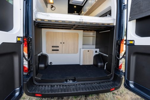 La salle d’eau se compose d’un WC, d’un lavabo et d’une douche. Ce cabinet de toilette peut s’isoler grâce à une paroi coulissante. Le couchage arrière est un lit transversal (143 x 187 cm) haut perché, offrant ainsi une soute XXL de 105 cm de haut.