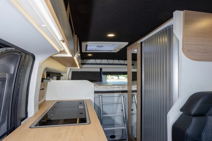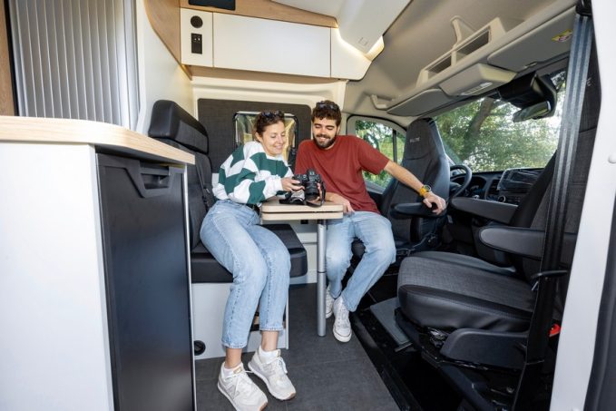 A l’intérieur, une ambiance claire et épurée. Une banquette face route, une table avec rallonge et deux sièges avant qui pivotent (difficilement, porteur Ford oblige) forment une agréable et très lumineuse dînette, grâce au lanterneau qui la surplombe.