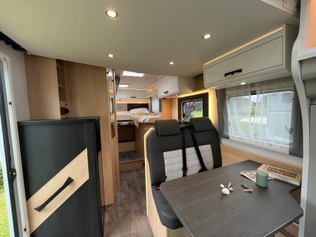 A bord de ce Sunlight, les ingénieurs ont opté pour un salon classique avec une banquette deux places positionnée face à la route. N'oublions pas d'y associer les sièges cabine pivotants au niveau du porteur..