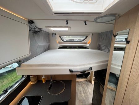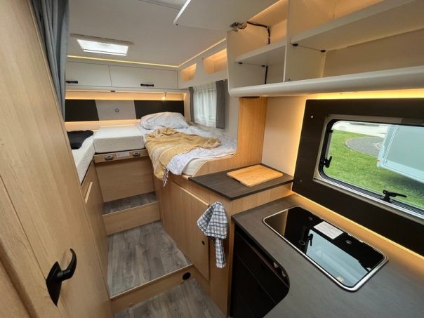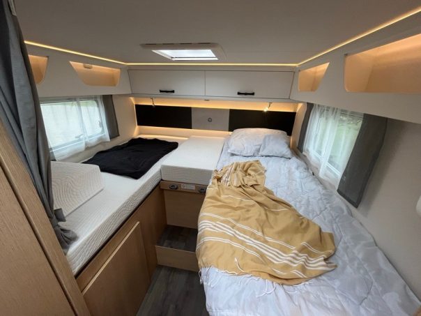Passons à l’arrière. Le T 670 S comporte deux lits jumeaux (192 x 80 cm) qui peuvent être joints avec coussins complémentaires et ainsi former un grand couchage de 210 x 153 cm. De nombreux rangements sont présents (placards en haut ou sous les lits).
