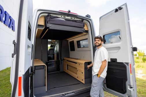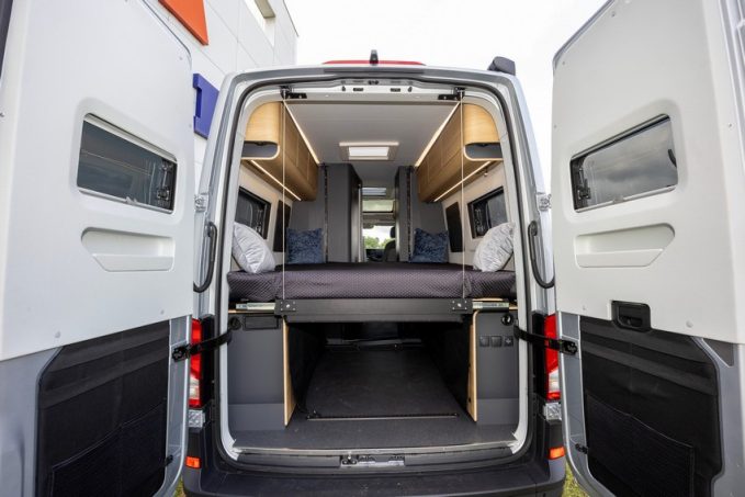 A l’arrière, se trouve un “lit de pavillon” (196 x 178 cm) électrique qui se remonte intégralement et… presque automatiquement, car il faut en effet replier un côté du matelas pour que le couchage puisse se loger entre les six placards hauts. Toute cette partie du fourgon peut alors être utilisée comme garage.