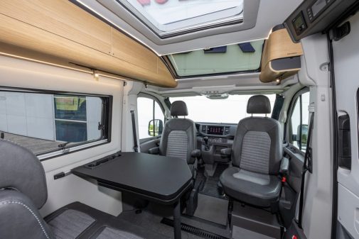 A l’avant, le 680 SGX s’organise autour d’un salon avec banquette deux places face route. Cet espace de vie est très lumineux grâce au grand toit panoramique ouvrant.