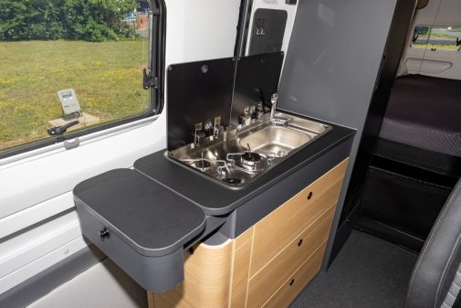 Le bloc-cuisine est doté d’un évier Inox, d’un réchaud deux feux, d’une petite rallonge au plan de travail amovible et d’un grand réfrigérateur de 138 litres.