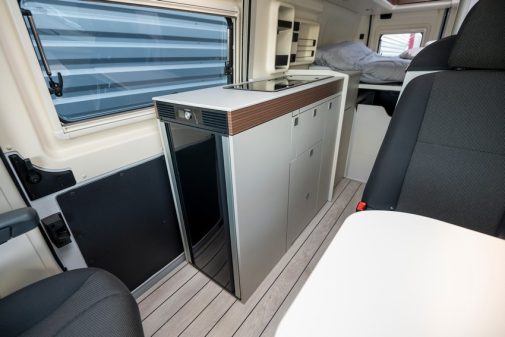 On notera par ailleurs la belle évolution du meuble de cuisine. Il est plus étroit, afin de dégager de l’espace, plus haut, et intègre désormais un réfrigérateur à double ouverture en bout. Les rangements y ont été particulièrement soignés (paniers fils, tiroirs intérieur/extérieur…).