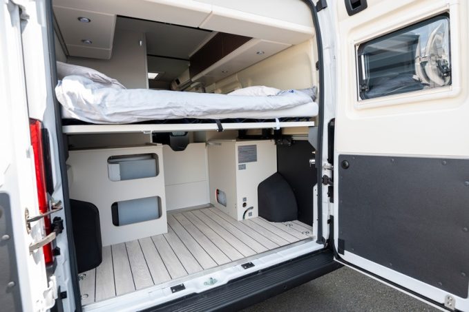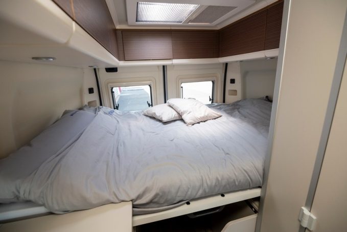 A l'arrière, un lit transversal pour deux personnes surmonte une soute. Plutôt pratique pour le rangement.
