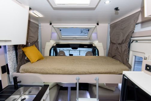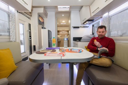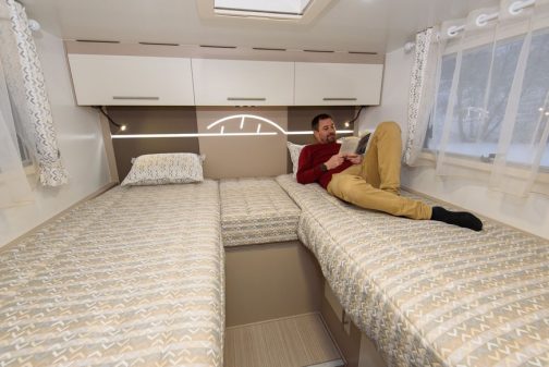 Au-dessus de la dînette, notre modèle d’essai était équipé d’un lit de pavillon (90 x 186 cm) pour une personne, disponible en option (2 180 €). Pour pouvoir en accueillir quatre à l’étape, il faut recourir à une autre option qui permet de convertir la dînette en couchage complémentaire.
