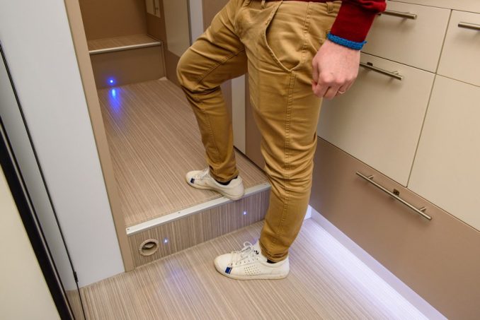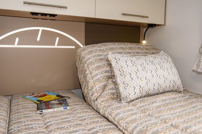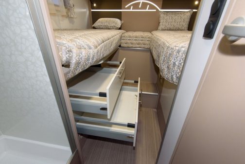 En partie arrière, nous trouvons des lits jumeaux, aux dimensions généreuses : 81 x 203 cm chacun. Les matelas haute densité à mémoire de forme, de 14 cm d’épaisseur, reposent sur un sommier à lattes. Soulignons la belle esthétique de la tête de lit. On accède aux couchages par un vaste couloir central, et une marche facilite la montée. Notin les a volontairement perchés à plus d’un mètre du plancher pour créer un volume de rangement (penderie, tiroirs et vaste soute accessible par deux portillons) en partie inférieure.