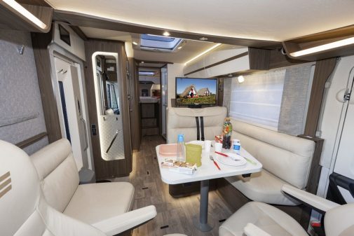 Nous accédons à la dînette depuis le poste de conduite. Sinon, au retour d’excursion, on utilise la clé de contact ou le badge RFID. Nous voici dans un salon classique dans sa disposition : une vaste banquette en L, un sofa latéral et les sièges pivotants Aguti. Ici, la luminosité est importante, grâce au concept d’éclairage sur quatre niveaux (du plancher au pavillon) et l’intégration d’un lanterneau panoramique longitudinal de 80 x 50 cm.