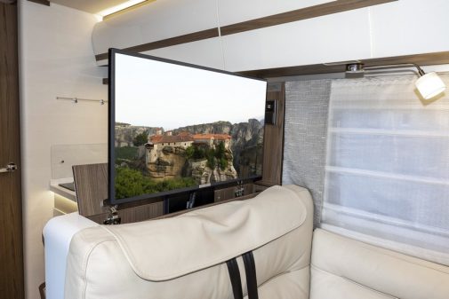 Le dossier de la banquette cache un pré-équipement radio/TV. Notre modèle bénéficiait d'une TV LED 32 pouces (un autre poste de 22 pouces dans la chambre), d'une antenne satelitte...